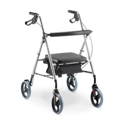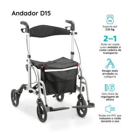 Reforçado com estrutura em alumínio, o Andador D15 é leve, firme e resistente. As rodas são silenciosas e é possível desmontá-lo para que fique compacto, sendo de fácil armazenamento.