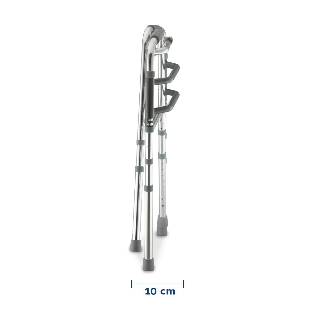 Compacto e dobrável, é fácil de armazenar e transportar, sendo também ajustável em até 8 níveis de altura, garantindo uma postura ergonômica adequada. Com estrutura reforçada e leve, suporta até 130 Kg de forma firme e resistente. Seus apoios de mãos ortopédicos são emborrachados para maior conforto e segurança, enquanto as ponteiras de borracha asseguram uma aderência sólida ao solo, promovendo uma caminhada estável e silenciosa.