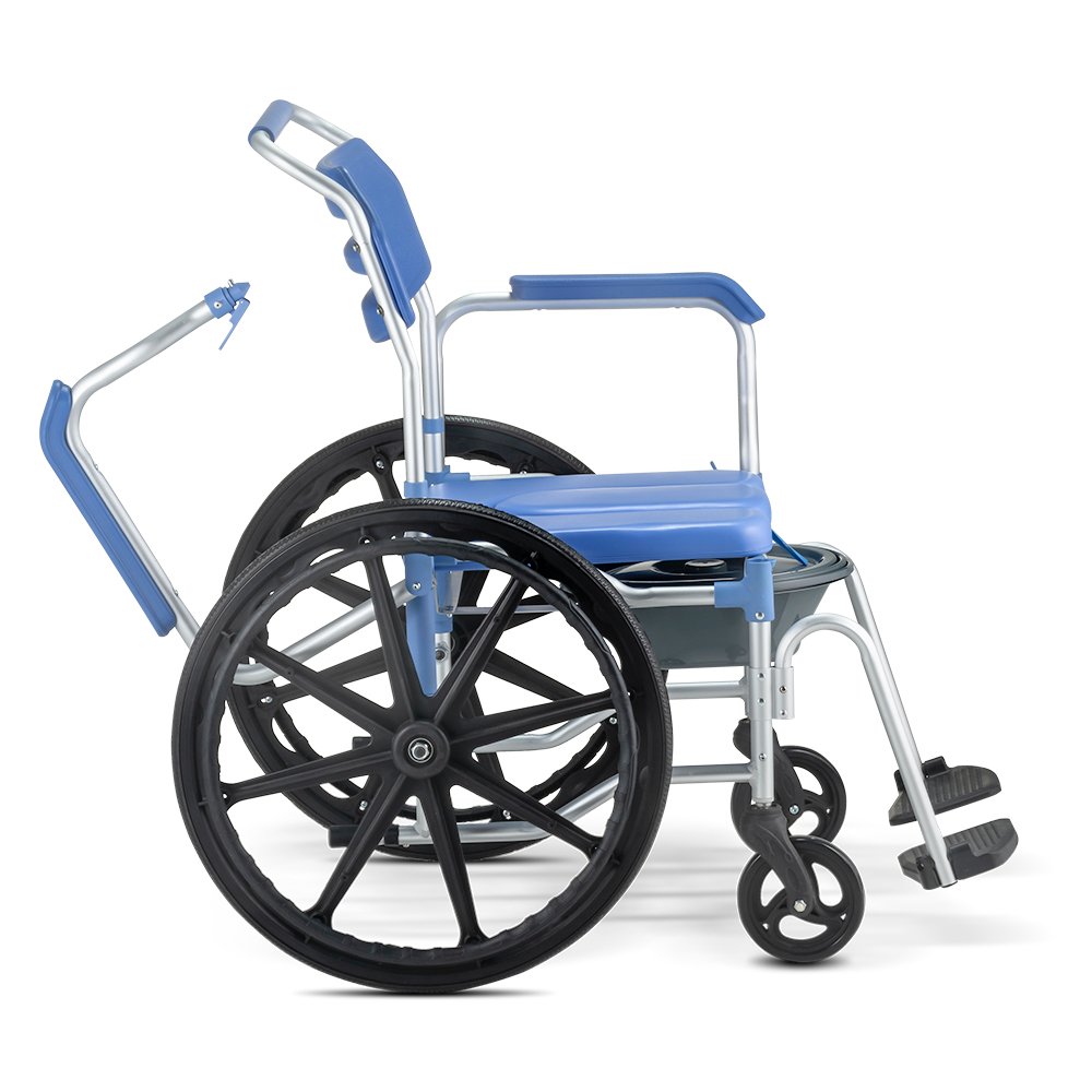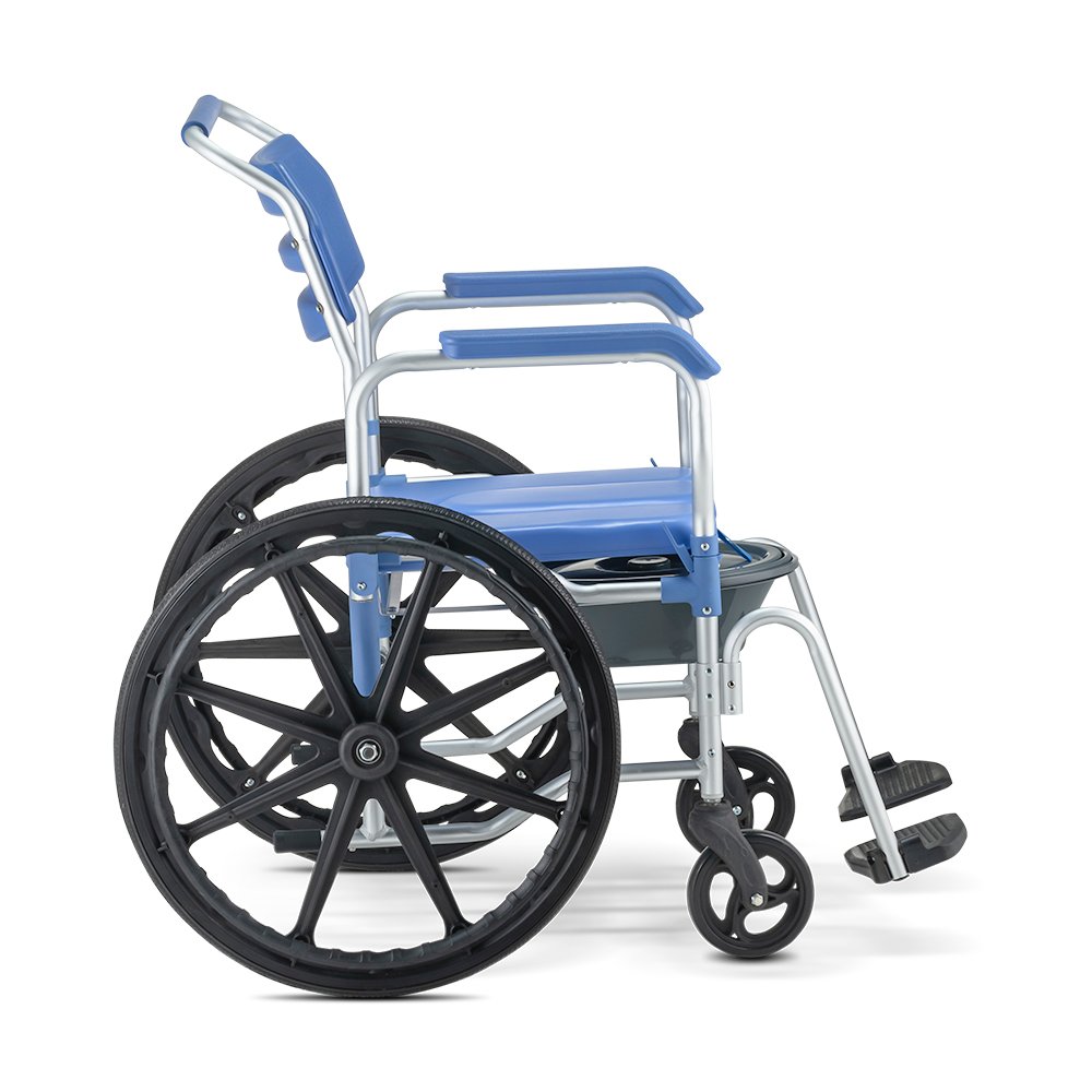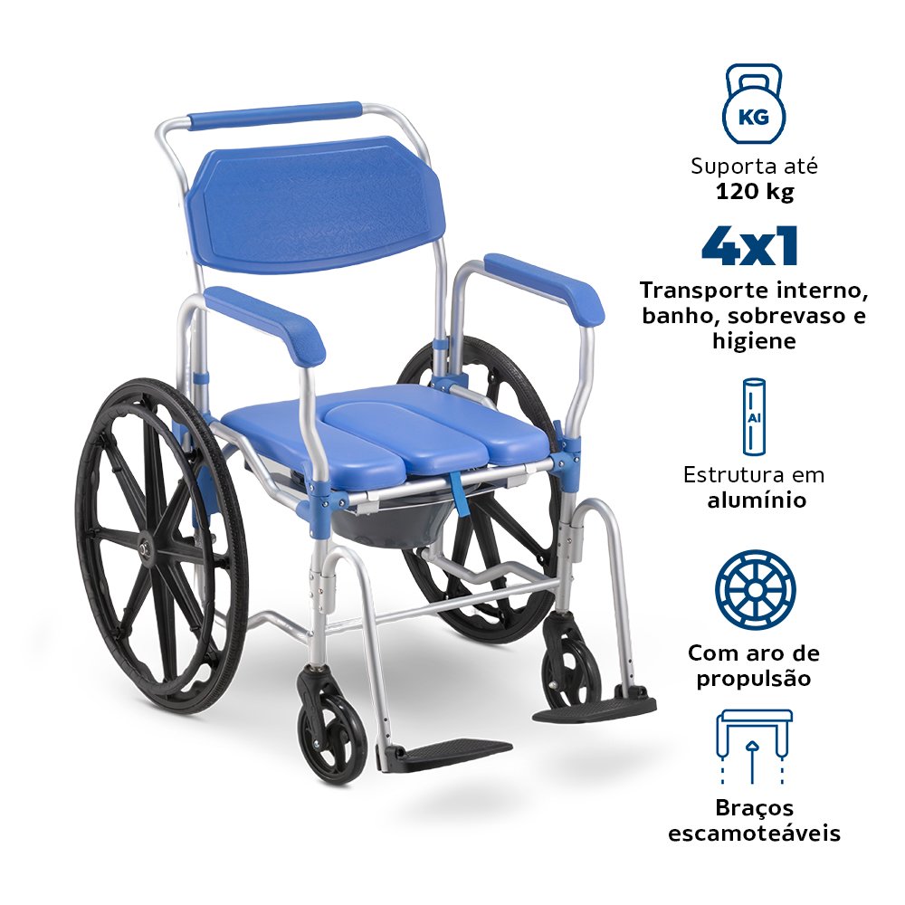 Seu design versátil permite o uso sobre o vaso sanitário, para banho e locomoção interna na casa. Além disso, a cadeira conta com apoio de pés rebatíveis com pino click, comadre inclusa e 4 rodízios blindados com rodas giratórias de 3 polegadas e travas de segurança.