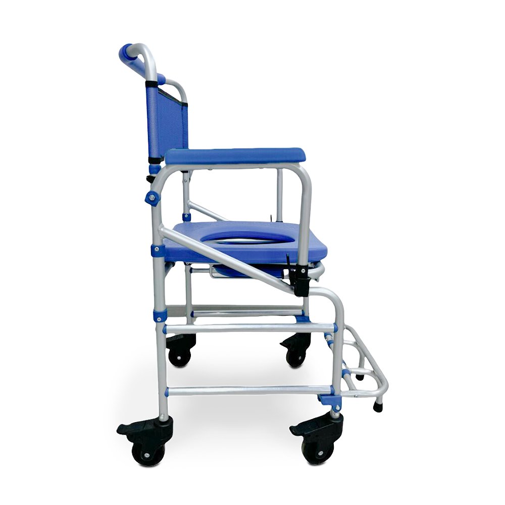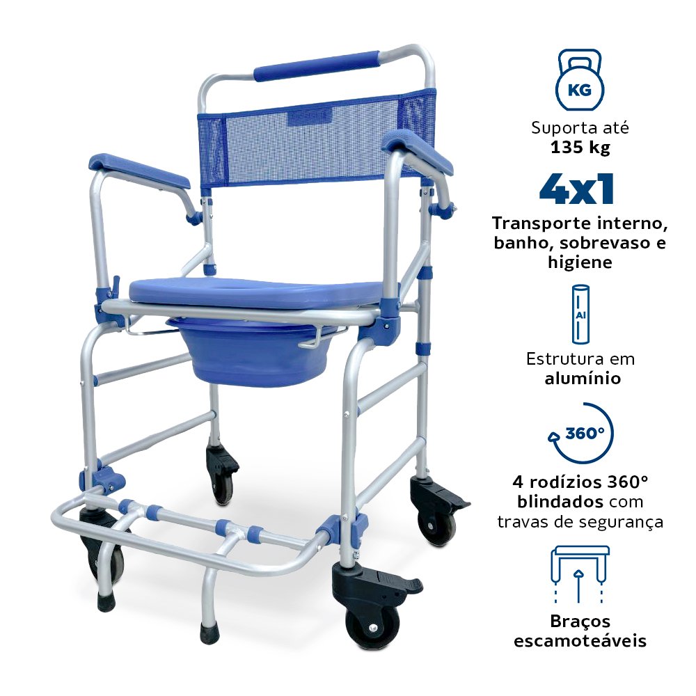 Seu design versátil permite o uso sobre o vaso sanitário, para banho e locomoção interna na casa. Além disso, a cadeira conta com apoio de pés rebatíveis com pino click, comadre inclusa e 4 rodízios blindados com rodas giratórias de 3 polegadas e travas de segurança.