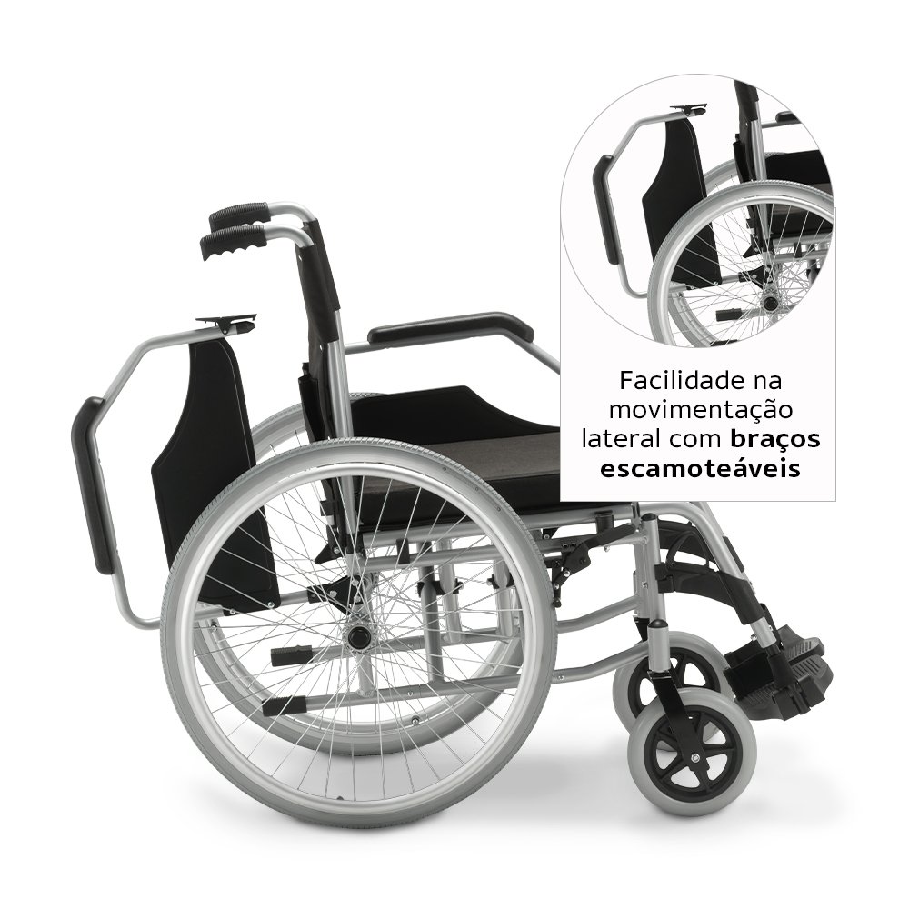 - Possui braços e pernas escamoteáveis, pedal com ajustes de altura, encosto fixo e quick release nas rodas traseiras.